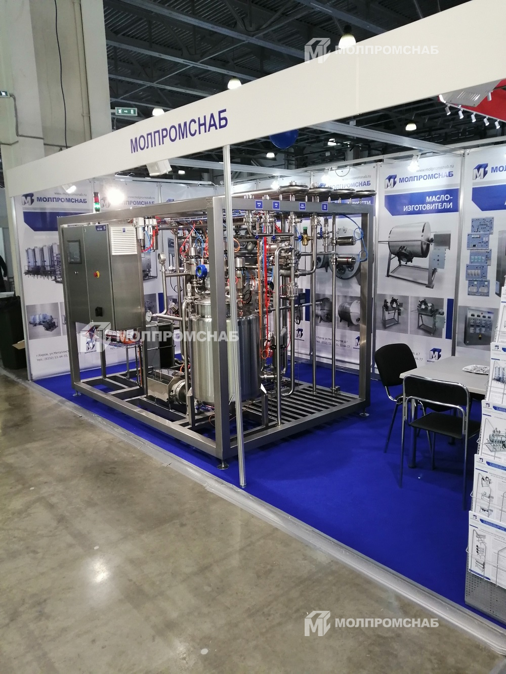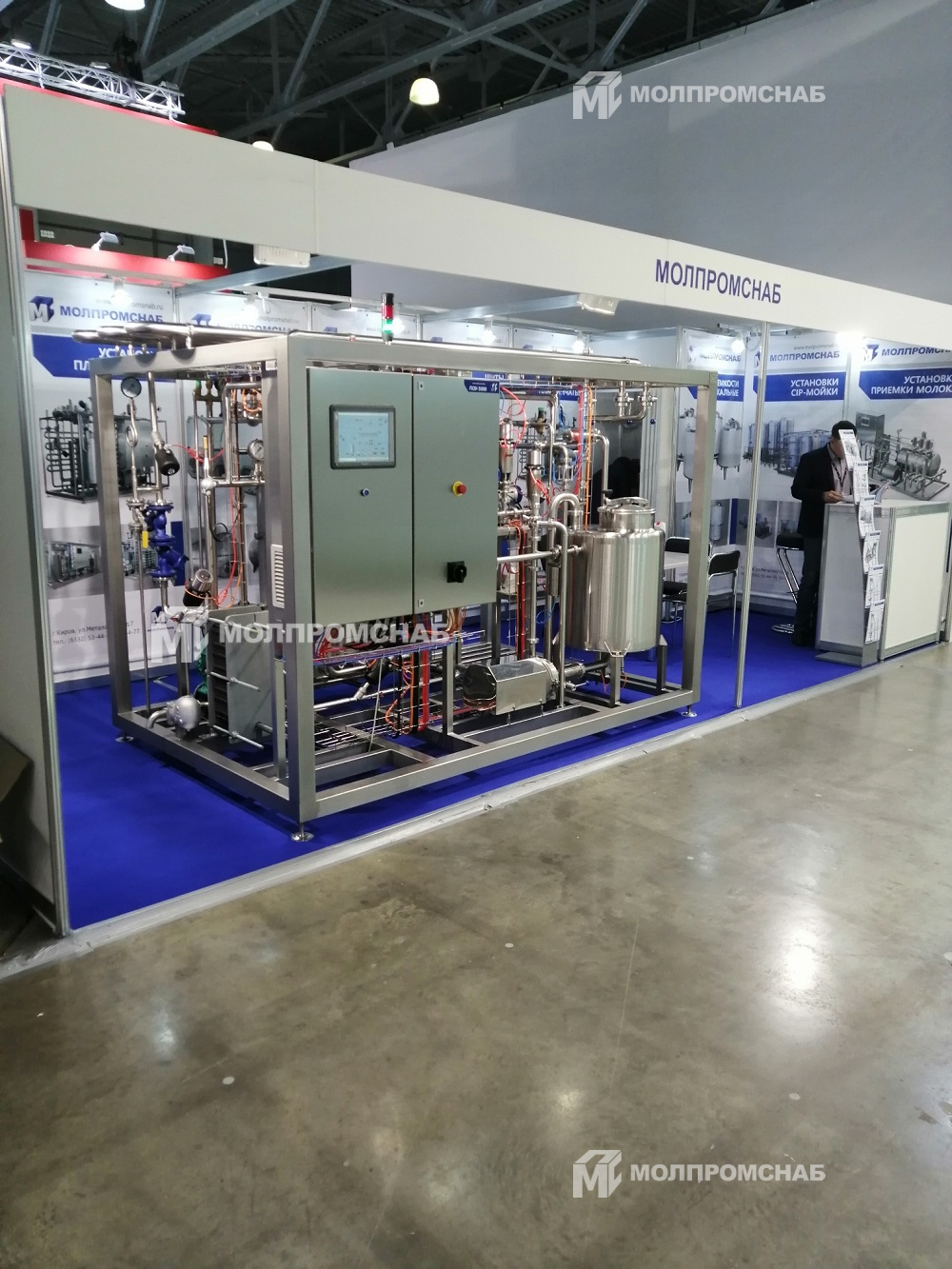 На стенде представлена теплообменная установка ПОУ-5000 для пастеризации молочной смеси на сыр с нормализацией в потоке.