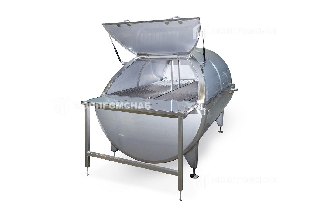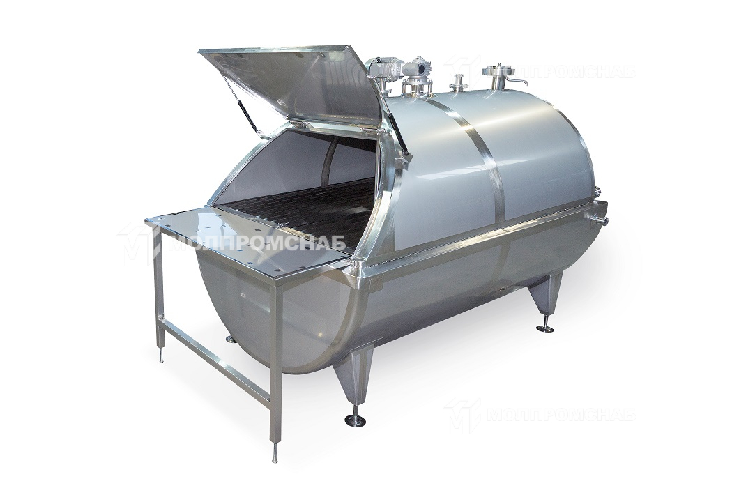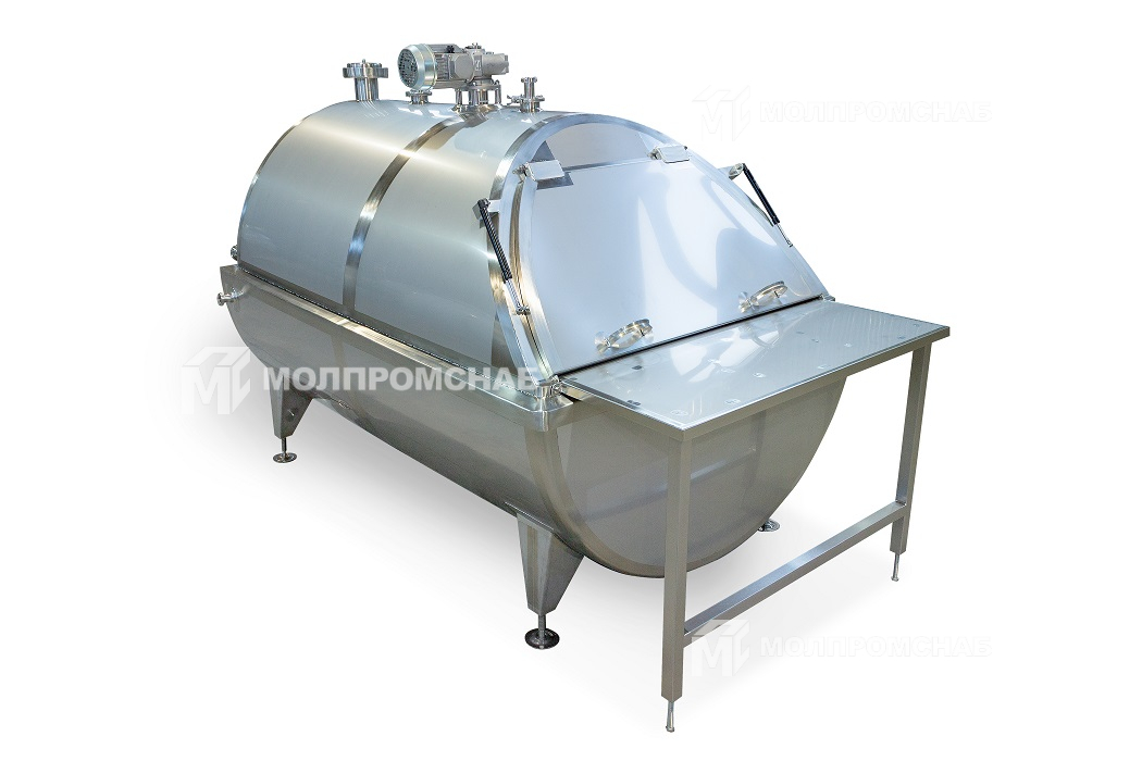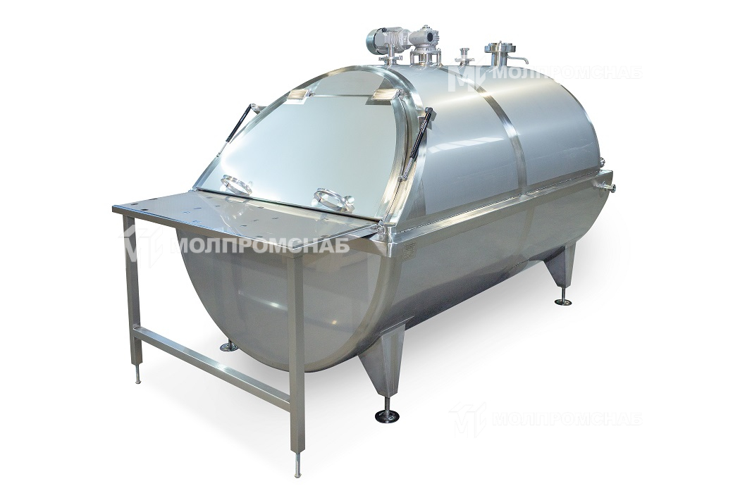 С торца ванна имеет откидную крышку. Сверху расположены клапан дыхательный, патрубки устройств моющих растворов и мотор-редуктор с приводом. Перемешивание продукта осуществляется лопастной мешалкой.