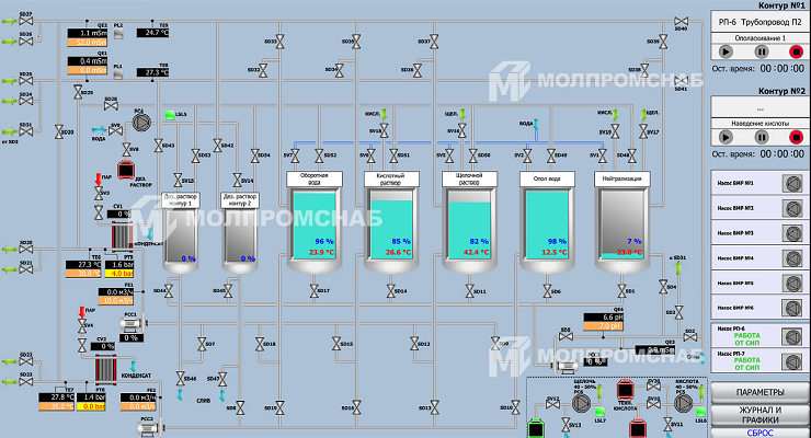 • автоматическое наведение рабочих растворов щёлочи и кислоты перед работой
