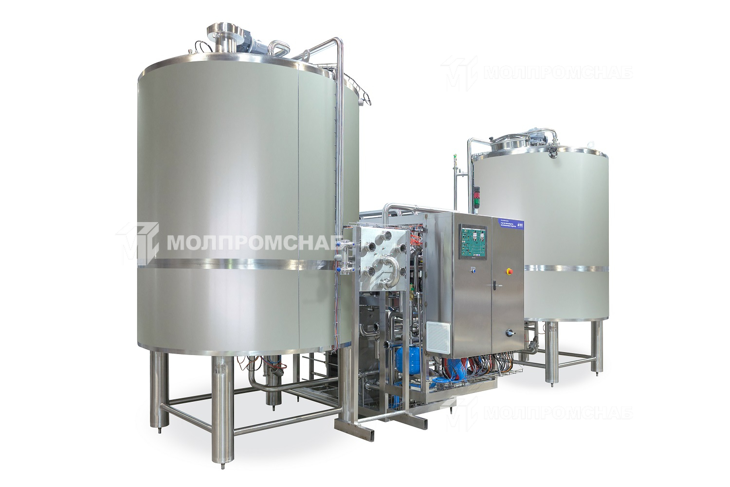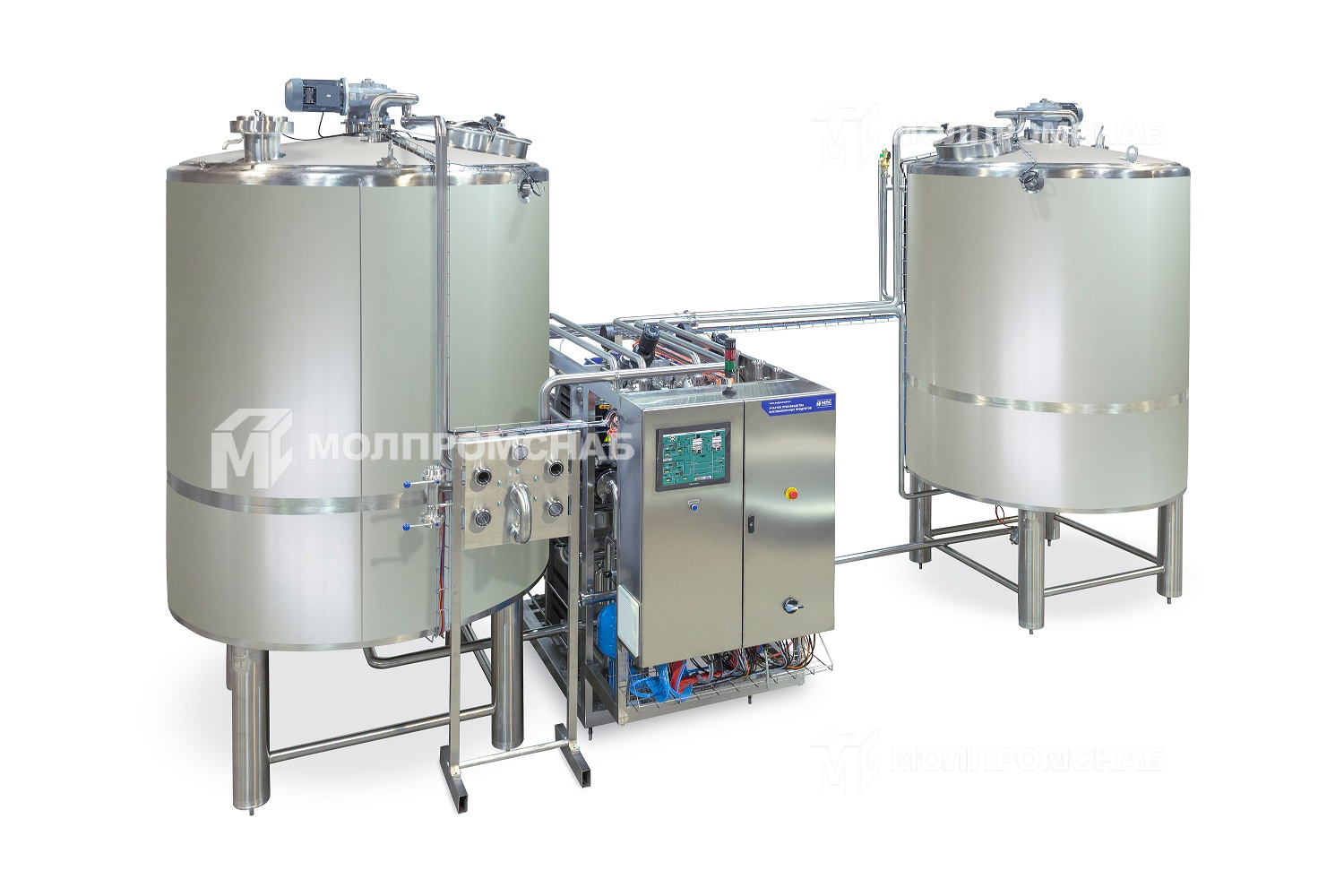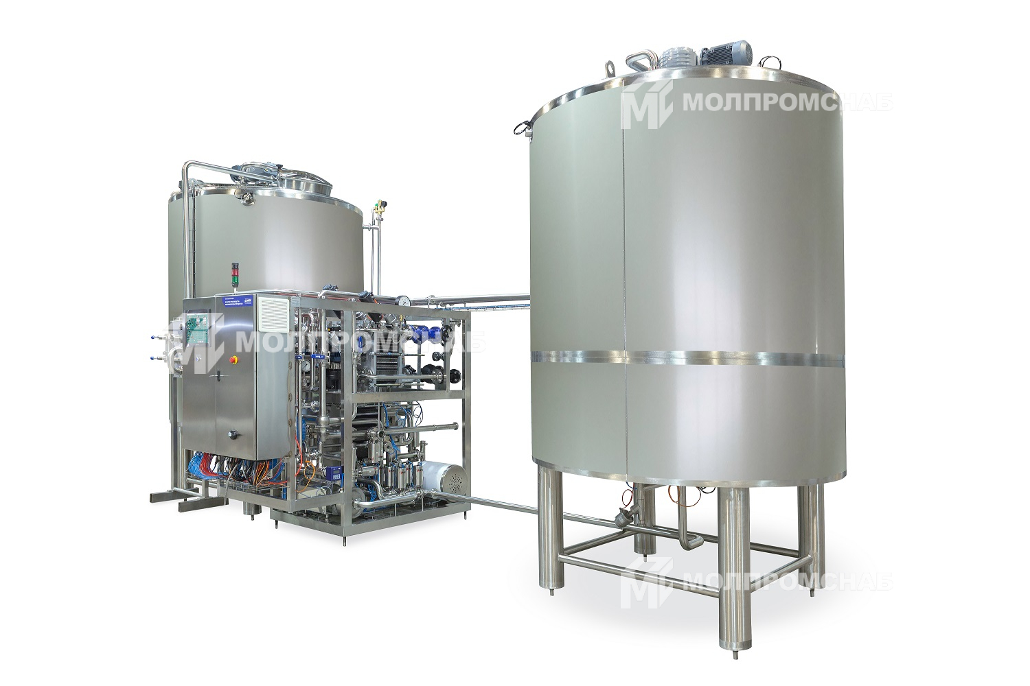 Для выработки высокотемпературных продуктов предусматривается теплообменник для подогрева молока в потоке до темературы 45-95 град С. Санитарная обработка установки производится от внешней CIP-станции.