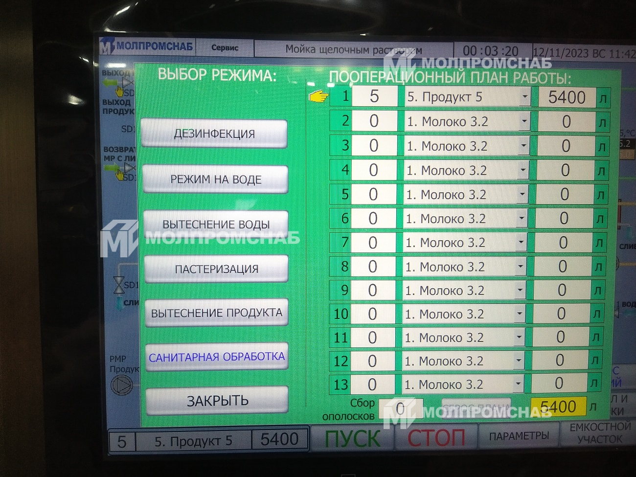 На втором экране щита управления отображен ряд емкостей, по заданию оператора возможен выбор емкости и объем пастеризованного молока, поступающего с установки.